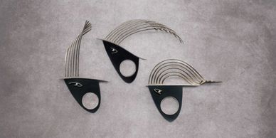 Серия брошей «Остановки нет» - творческий эксперимент в области формообразования, лаконичность, микродизайн, регламентированные правила и ритмы мегаполиса, простая линейная геометрия и трехмерный объем, мельхиор, титан, молочные пластины кахолонга и калканская яшма асфальтовых тонов...